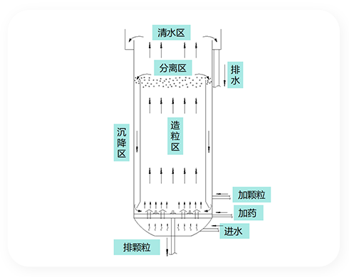 化學結晶循環造粒是通過向水中投加化學藥劑,使的水中的Ca2+、Mg2+離子發生化學反應生成CaCO3/Mg(OH)2晶體,附著到晶種表面,進而將水中硬度降低,不產生副產物,產生的CaCO3顆粒可以回收利用。
