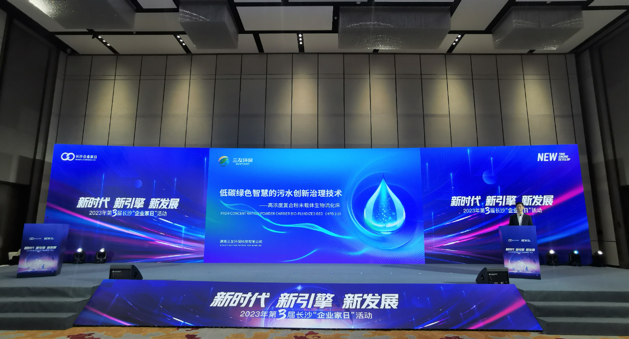 11月1日,“新時代、新引擎、新發展”——2023年第3屆長沙“企業家日”活動在北辰國際會議中心召開。作為企業家代表,三友環保董事長侯丹受邀出席,并于活動現場成功發布綠色低碳智慧的污水創新治理技術——高濃度復合粉末載體生物流化床技術(簡稱HPB技術)。