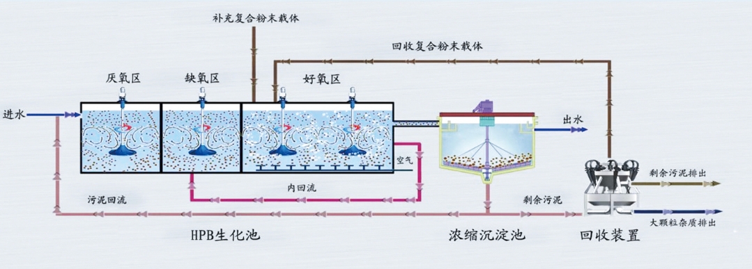 作為一種高效低碳同步脫氮除磷技術(shù),HPB技術(shù)基于污水生物處理的技術(shù)原理,通過向生化池中投加復(fù)合粉末載體,提高生物池混合液濃度的同時(shí),構(gòu)建了懸浮生長和附著生長“雙泥” 共生的流化床系統(tǒng);并通過污泥濃縮分離單元、復(fù)合粉末載體回收單元,實(shí)現(xiàn)了“雙泥齡”,強(qiáng)化了生物脫氮除磷效率。
